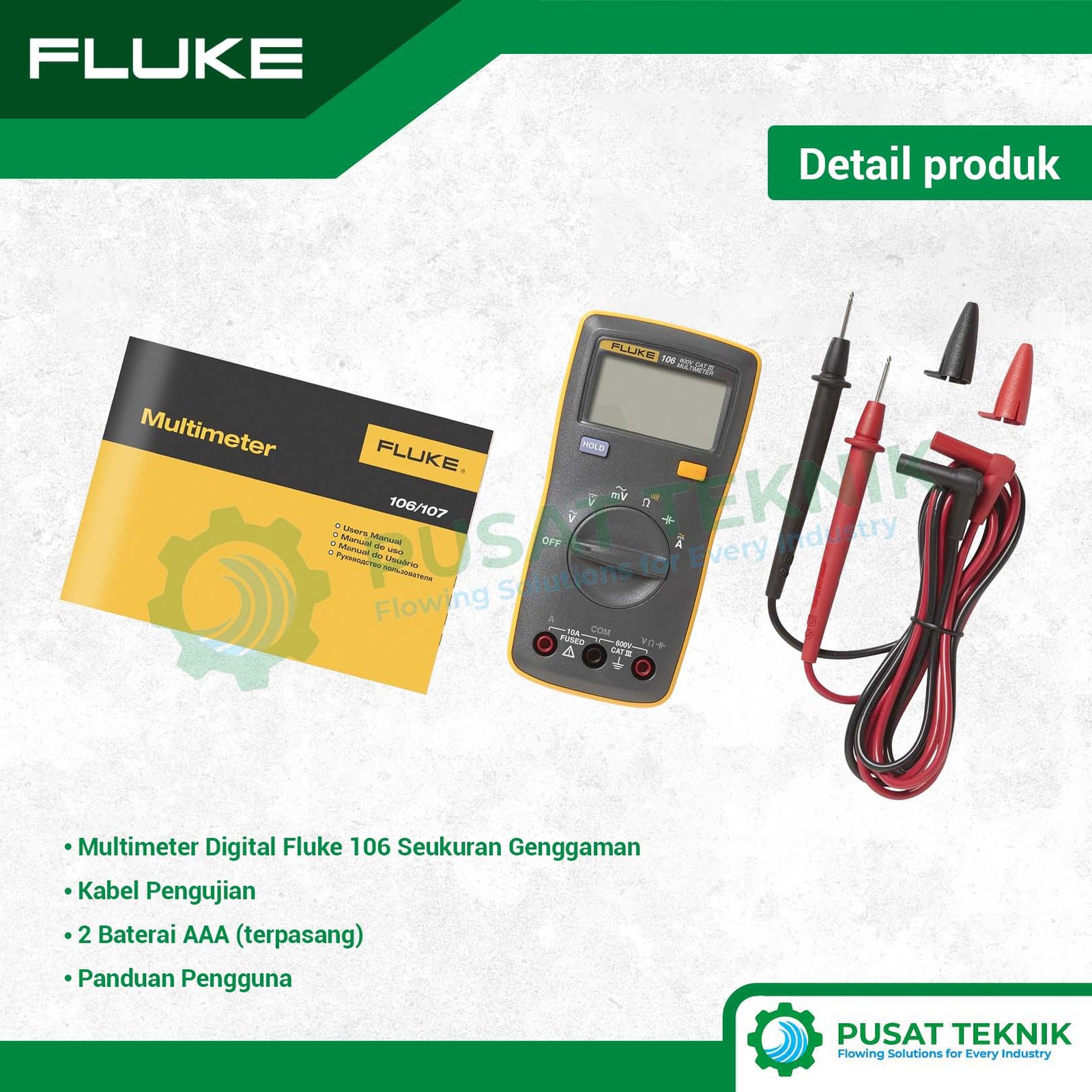 Fluke 106 adalah multimeter digital seukuran telapak tangan yang dirancang untuk bekerja bersama Anda. Dengan pengoperasian yang mudah dan fitur lengkap seperti pengukuran arus AC/DC hingga 10A, alat ini menjadi standar baru untuk mobilitas teknisi di lapangan.