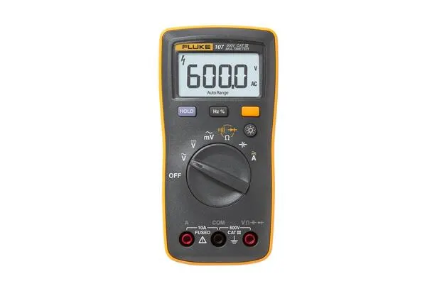 Fluke 107 adalah multimeter digital mungil namun bertenaga yang dilengkapi dengan layar berlampu latar (backlight). Alat ini sangat handal untuk mengukur tegangan, resistansi, kontinuitas, kapasitansi, hingga pengujian frekuensi dan siklus tugas (duty cycle).