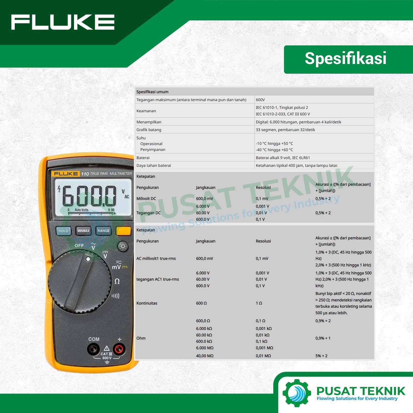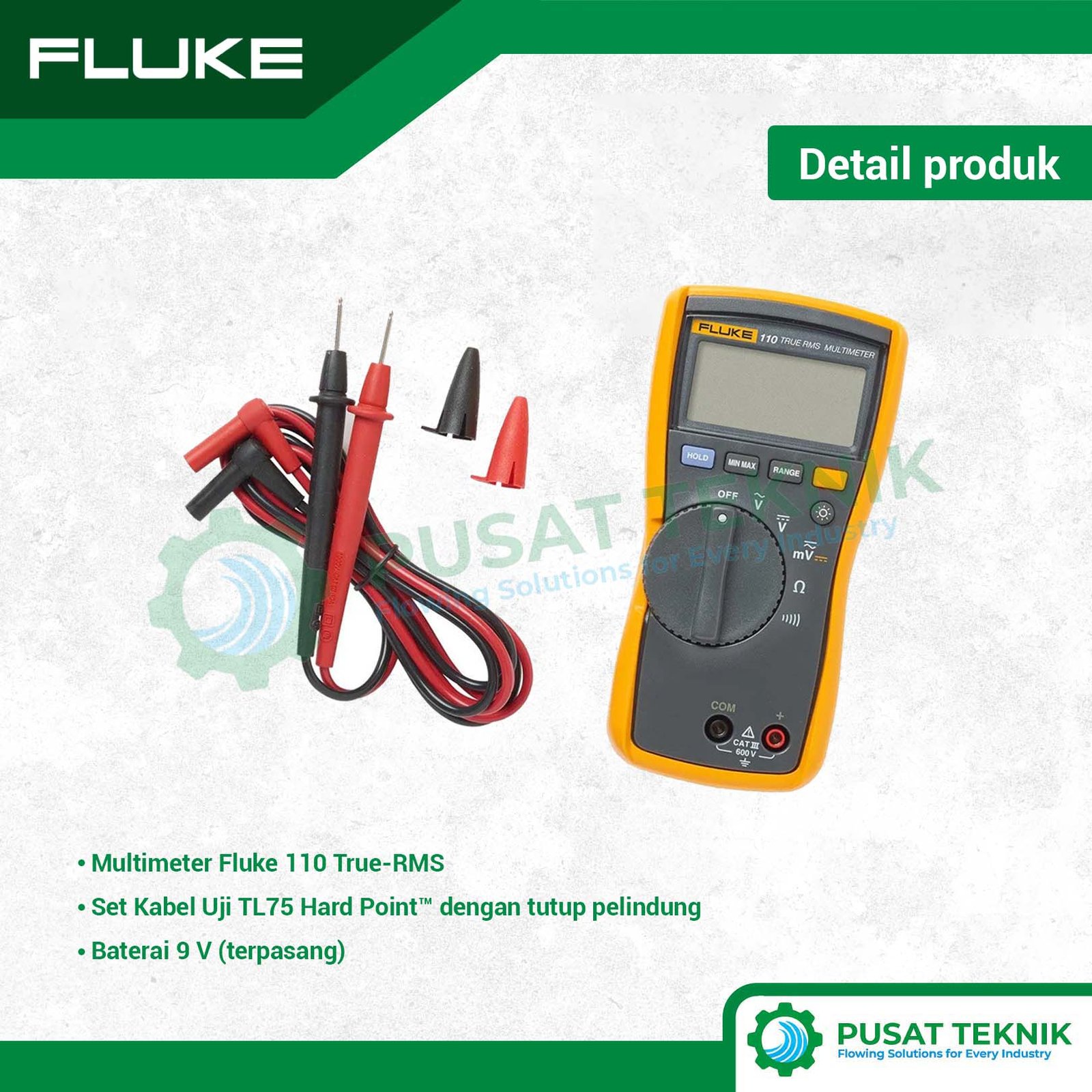 Fluke 110 adalah multimeter digital True-RMS yang dirancang khusus untuk pengujian kelistrikan dasar dengan akurasi luar biasa. Alat ini menjadi pilihan tepat bagi teknisi pemukiman maupun komersial yang membutuhkan hasil pembacaan yang stabil pada sistem listrik modern.