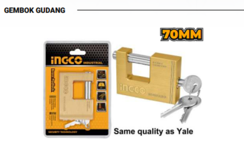 Gembok Gudang Ingco 70mm memberikan perlindungan keamanan maksimal untuk pintu gudang, gerbang pabrik, hingga kontainer. Gembok ini menggunakan material besi solid yang sangat tebal sehingga tahan terhadap upaya pengrusakan paksa seperti pemotongan atau pemukulan. Selain itu, mekanisme silinder berbahan kuningan asli memastikan kunci bekerja dengan halus dan tidak mudah macet meskipun terkena cuaca ekstrem.