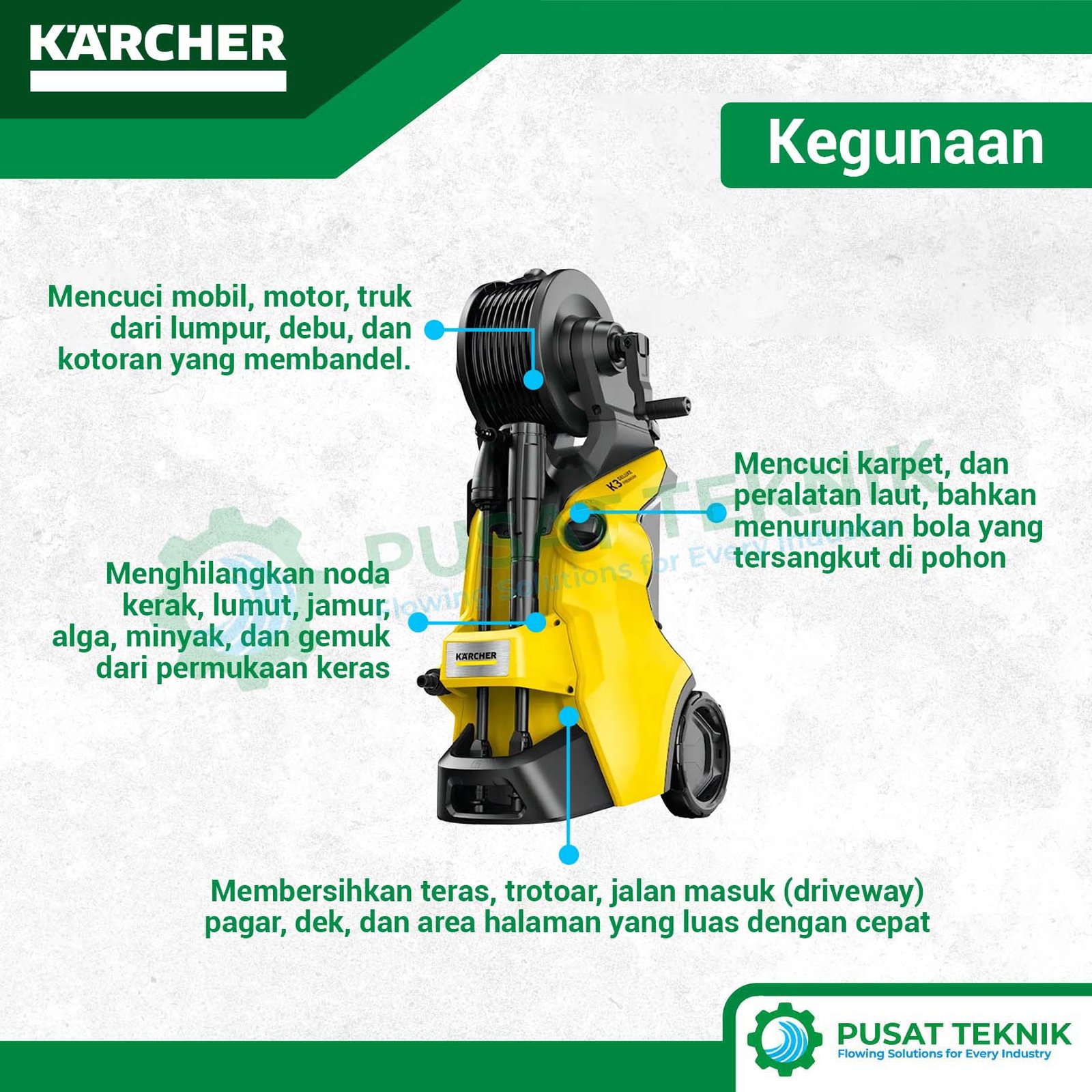 Tingkatkan efisiensi pembersihan Anda dengan Mesin Jet Cleaner Karcher K 3 Deluxe Premium. Alat ini memiliki tangki deterjen terintegrasi dan sistem penyimpanan selang yang praktis, sangat cocok untuk membersihkan area luas dengan hasil yang profesional dan cepat.
