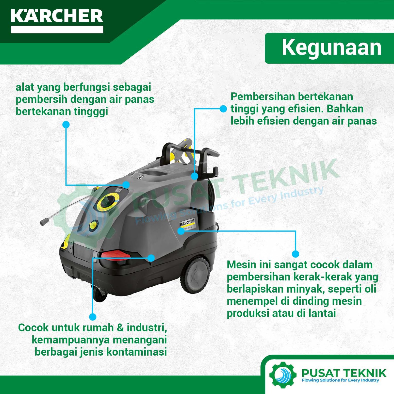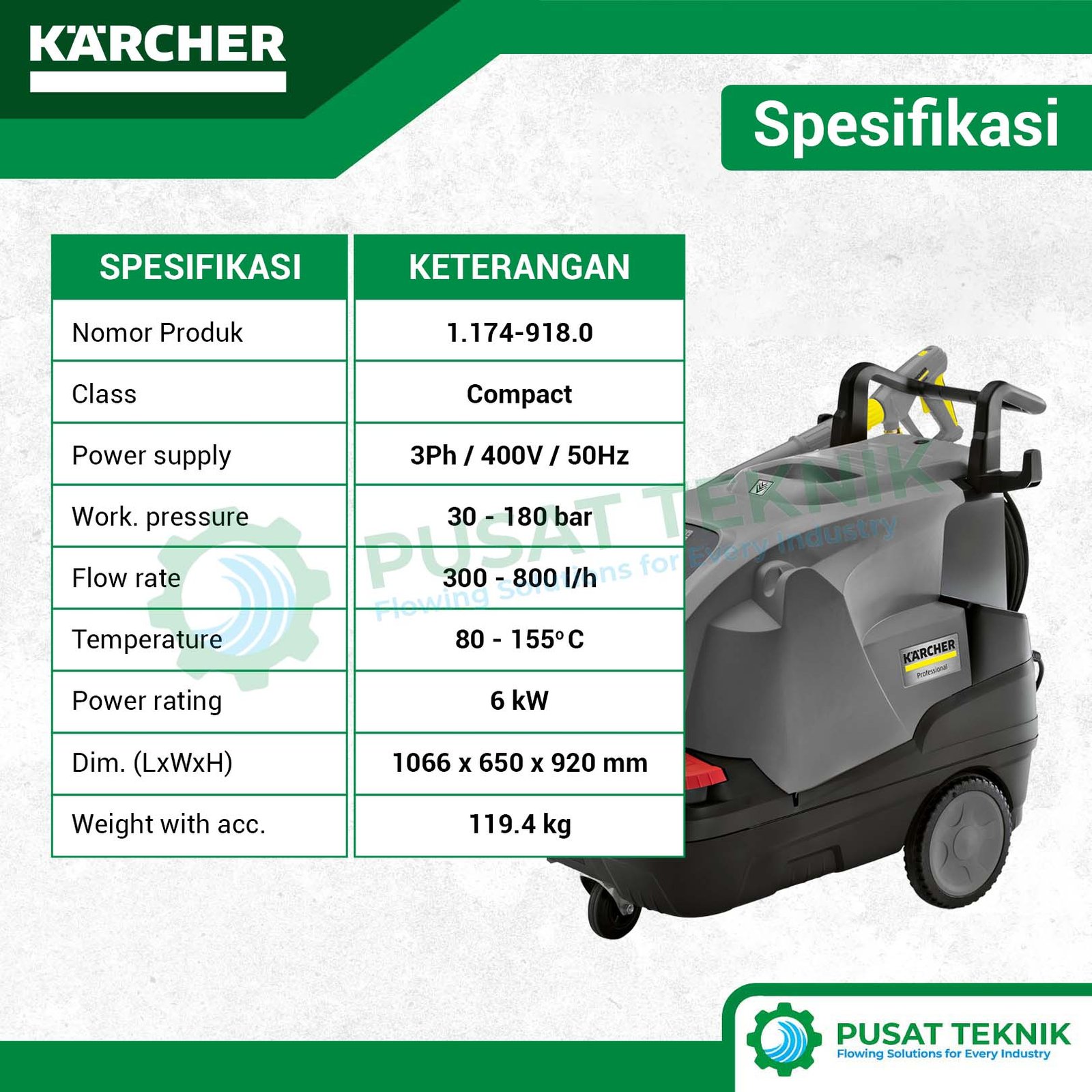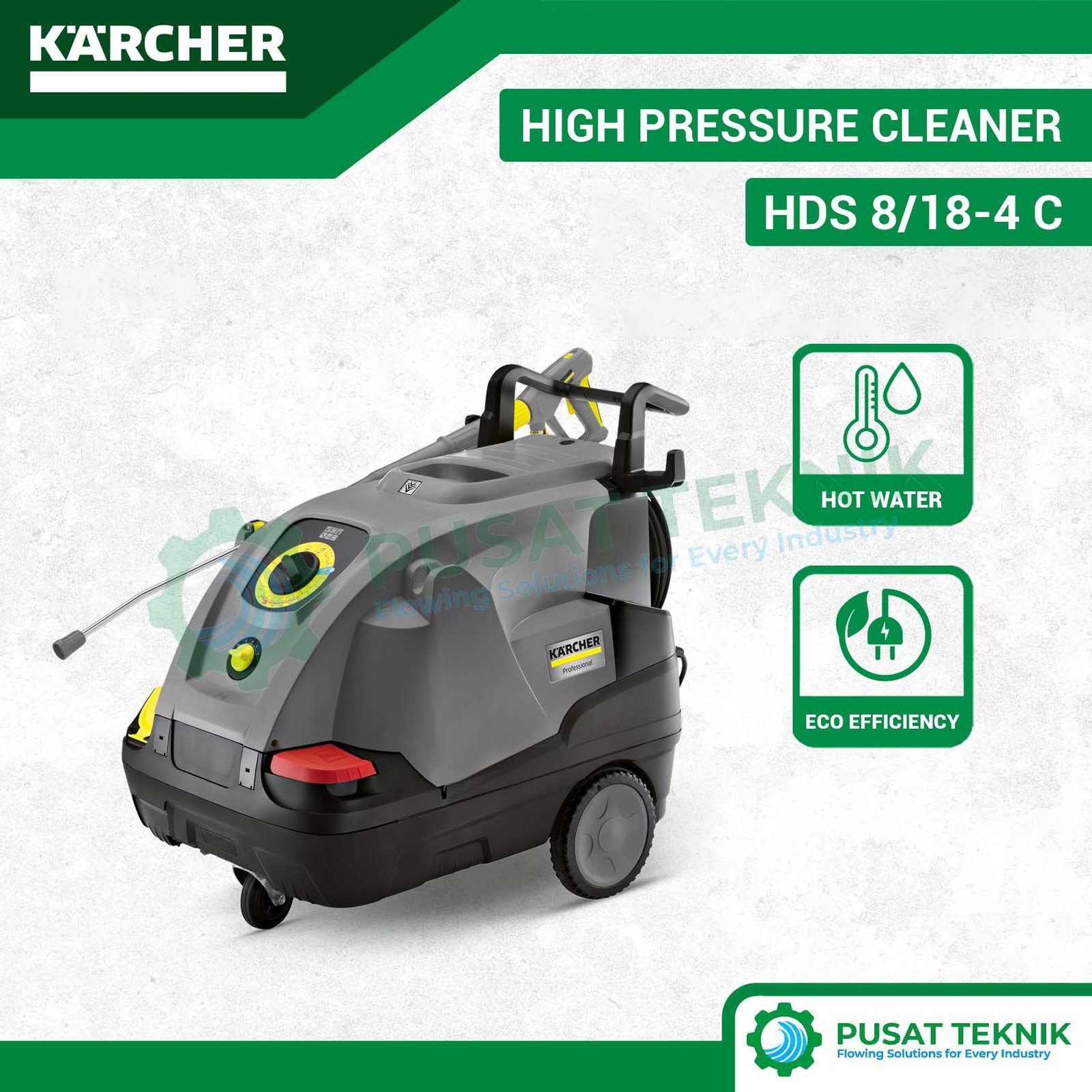 Menghilangkan noda minyak dan lemak yang membandel kini menjadi jauh lebih praktis bagi Anda. Produk Karcher menghadirkan seri HDS 8/18-4 C sebagai solusi pembersihan air panas yang sangat handal untuk penggunaan profesional. Mesin ini mengandalkan motor 4-pole berpendingin air guna memastikan performa unit tetap prima meskipun Anda gunakan secara intensif setiap harinya.