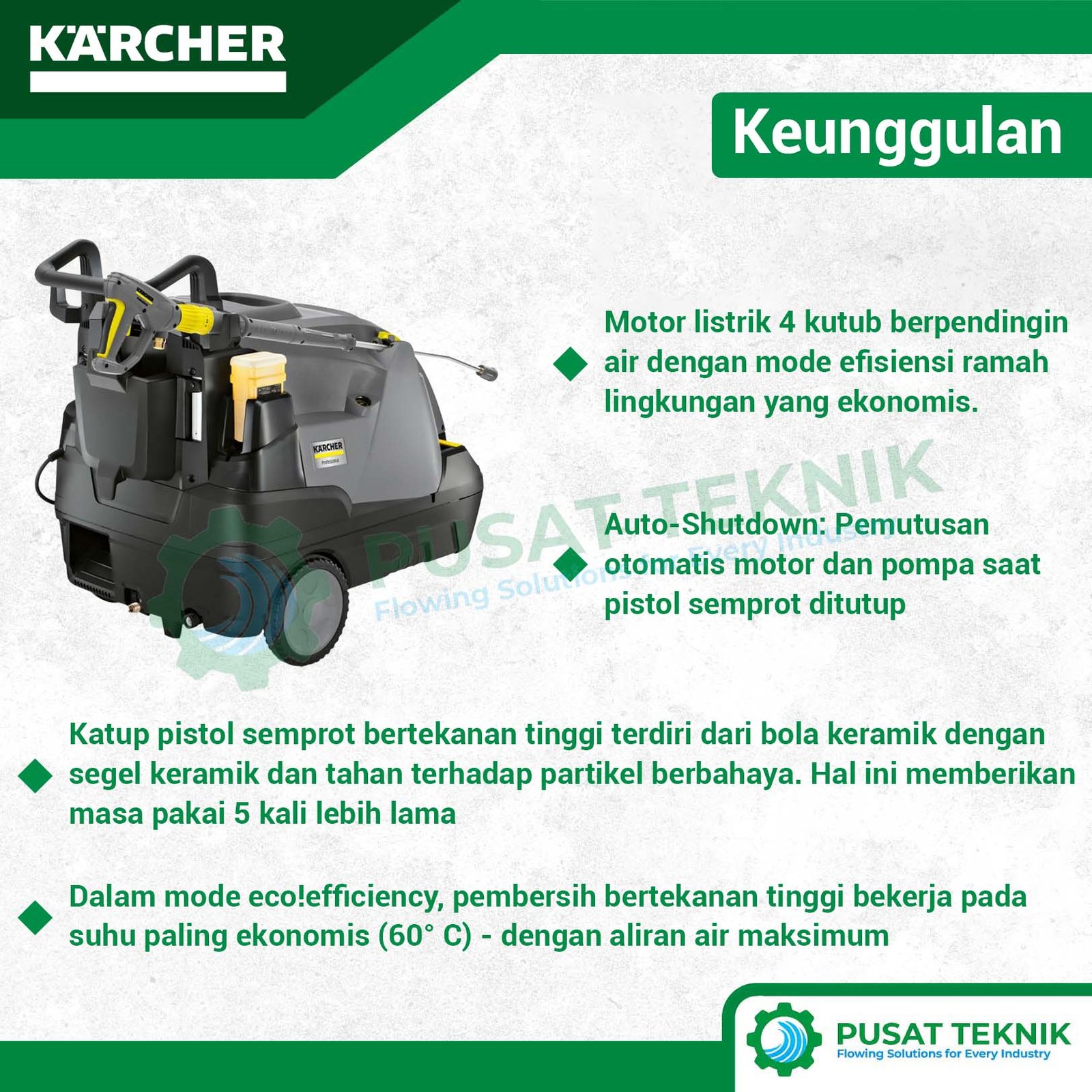 Keunggulan utama dari model ini terletak pada penggunaan motor listrik berkecepatan rendah yang sangat tahan lama. Oleh karena itu, tingkat kebisingan mesin menjadi jauh lebih rendah sehingga Anda dapat bekerja dengan lebih nyaman di lingkungan sekitar. Selain itu, investasi pada High-pressure cleaner ini sangat menguntungkan karena fitur eco!efficiency mengoptimalkan pembakaran guna menghemat biaya operasional bulanan perusahaan Anda secara maksimal.