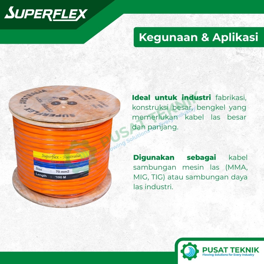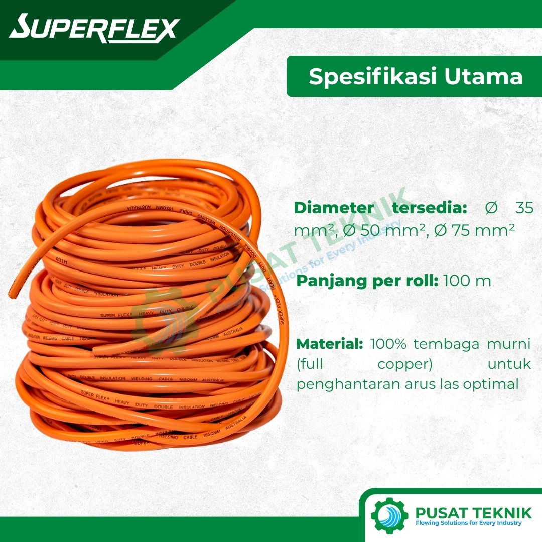 Superflex Australia menghadirkan solusi kabel las premium yang secara khusus memenuhi kebutuhan pengelasan berat (heavy duty). Kabel ini menggunakan 100% material tembaga murni (bukan campuran aluminium/CCA), sehingga menjamin hantaran arus listrik tetap stabil tanpa hambatan yang berarti. Dengan konduktivitas maksimal, alat ini secara langsung membantu Anda menghasilkan las yang lebih matang, kuat, dan rapi pada setiap sambungan logam.