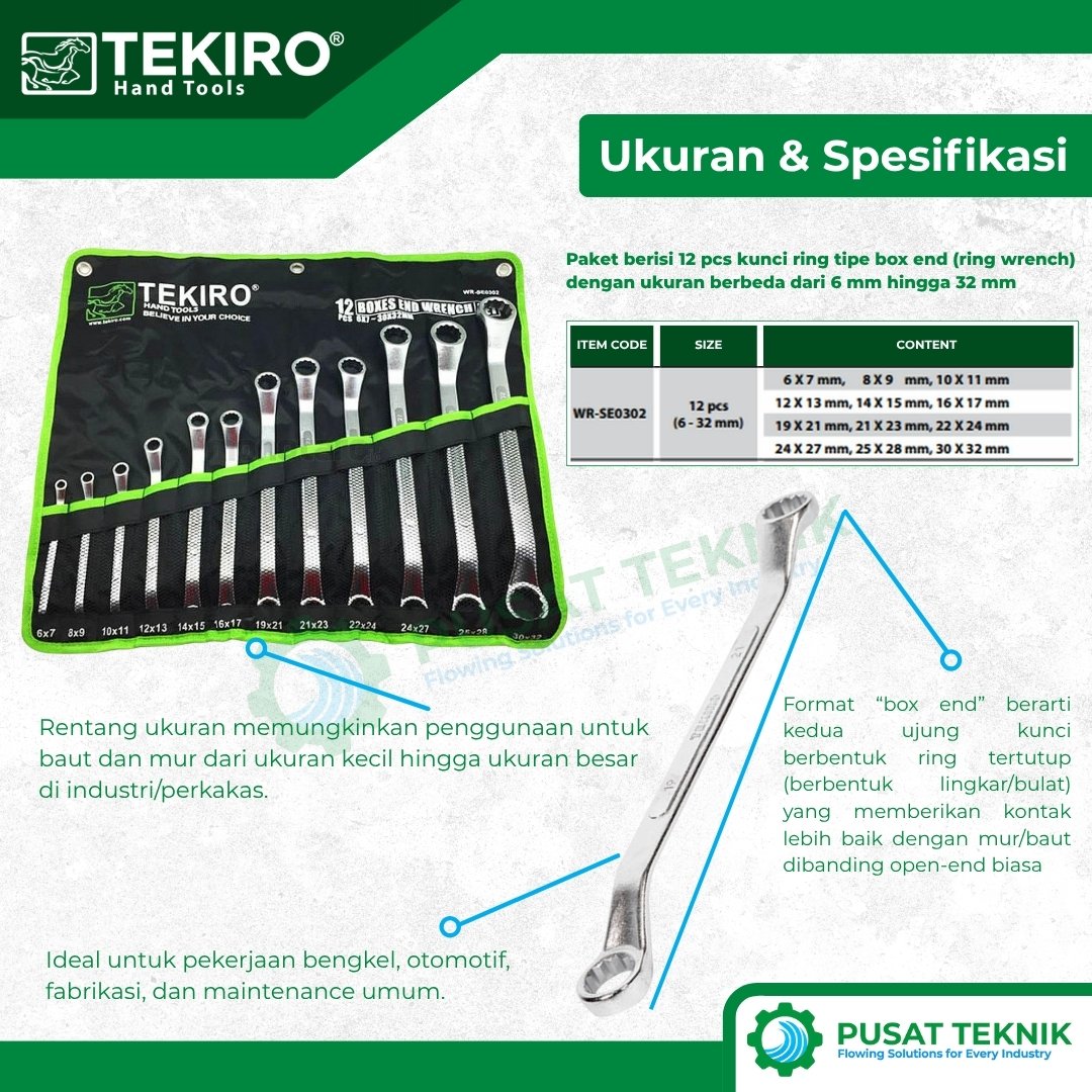 Kunci Ring Tekiro Sunk Panel (Box End Wrench) merupakan alat perkakas premium berbahan Chrome Vanadium yang memiliki daya tahan luar biasa. Desain sunk panel memberikan kekuatan bodi ekstra, sementara dua ujung ringnya memastikan cengkeraman maksimal pada baut tanpa merusak sudutnya, sangat cocok untuk pekerjaan torsi tinggi di industri otomotif.