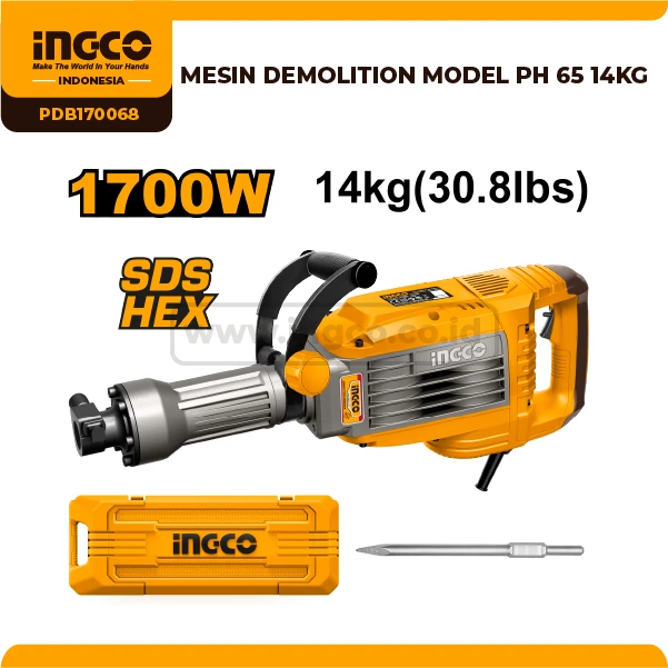 Mesin Demolition PH Ingco 65 14kg merupakan solusi penghancur beton profesional untuk skala proyek besar. Alat ini menawarkan daya pukul 45 Joule yang sangat dahsyat. Selain itu, motor 1500W di dalamnya menjamin performa yang stabil saat membongkar aspal atau fondasi. Desain bodi metal yang kokoh menjadikannya alat paling tangguh untuk pekerjaan berat setiap hari.