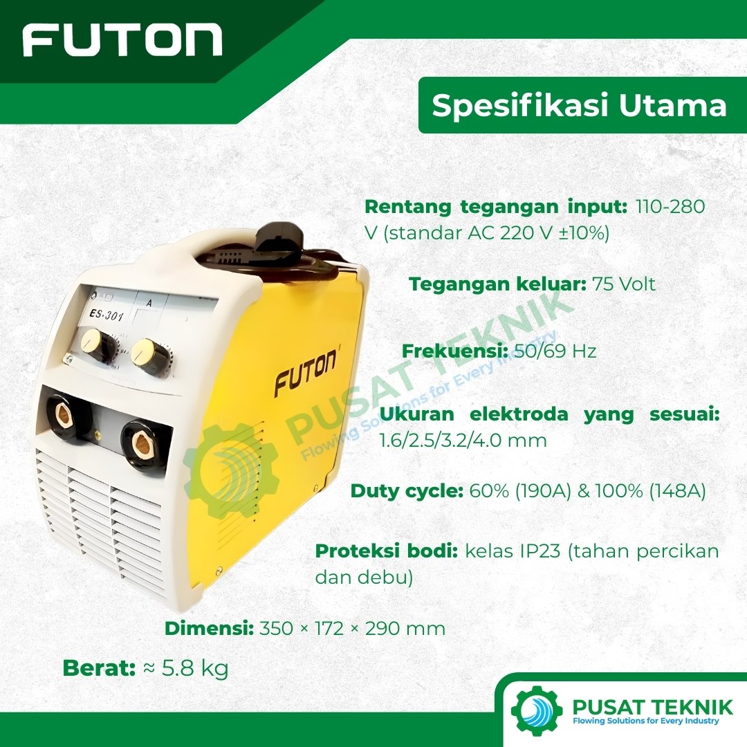 Futon ES 301 adalah mesin las inverter 190A profesional dengan teknologi IGBT yang hemat energi dan stabil. Dirancang tangguh dengan standar IP23 (tahan percikan air) dan mampu bekerja pada voltase rendah (110V), mesin seberat 5.7 kg ini adalah pilihan utama untuk bengkel, konstruksi baja, hingga penggunaan pribadi harian yang membutuhkan durabilitas tinggi.