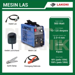 – Kelengkapan: Pemegang Elektroda, Earth Clamp, Kabel Las, Kedok Las, dan Kaca