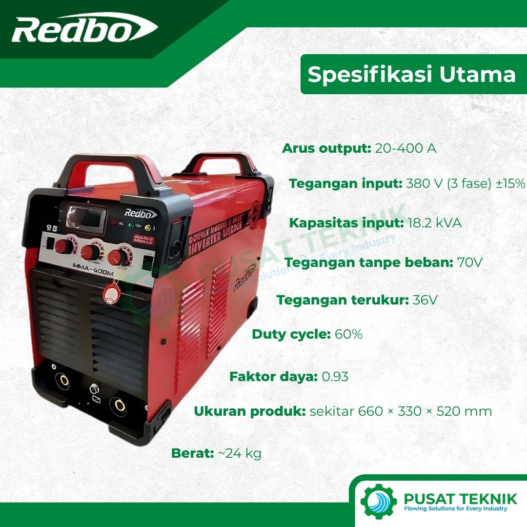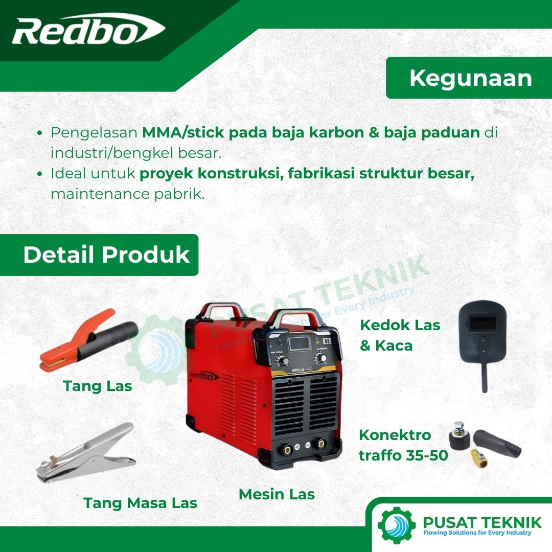 Selanjutnya, sebagai bagian dari lini alat las & pemotong profesional, mesin ini memberikan penetrasi pengelasan yang sangat dalam dan konsisten melalui arus output hingga 400 Ampere. Dukungan teknologi HF (High Frequency) Start memungkinkan penyalaan busur api secara instan dan halus, sehingga meminimalisir kegagalan awal pada proses pengelasan. Jika Anda mencari mesin las inverter yang menawarkan durabilitas tinggi dan produktivitas tanpa henti, REDBO MMA 400M merupakan solusi terbaik untuk pabrik maupun bengkel alat berat Anda.