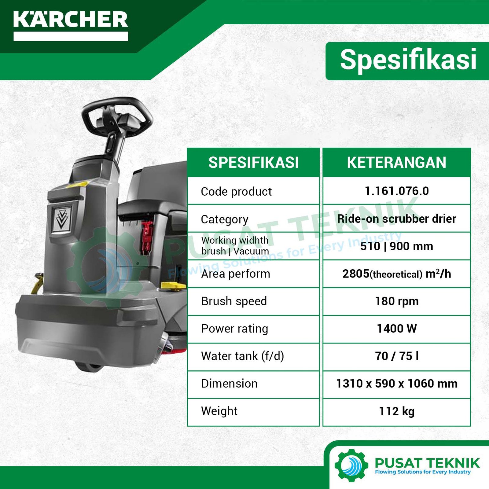 Keunggulan utama dari model ini terletak pada kapasitas tangki 70 liter yang mampu mendukung durasi kerja lebih lama tanpa sering berhenti. Oleh karena itu, tim kebersihan Anda dapat menyelesaikan area parkir tertutup atau aula besar dengan waktu yang lebih singkat. Selain itu, penggunaan sikat tipe disc berdiameter 51 cm memastikan tekanan sikat merata untuk mengangkat kotoran yang membandel secara efektif.