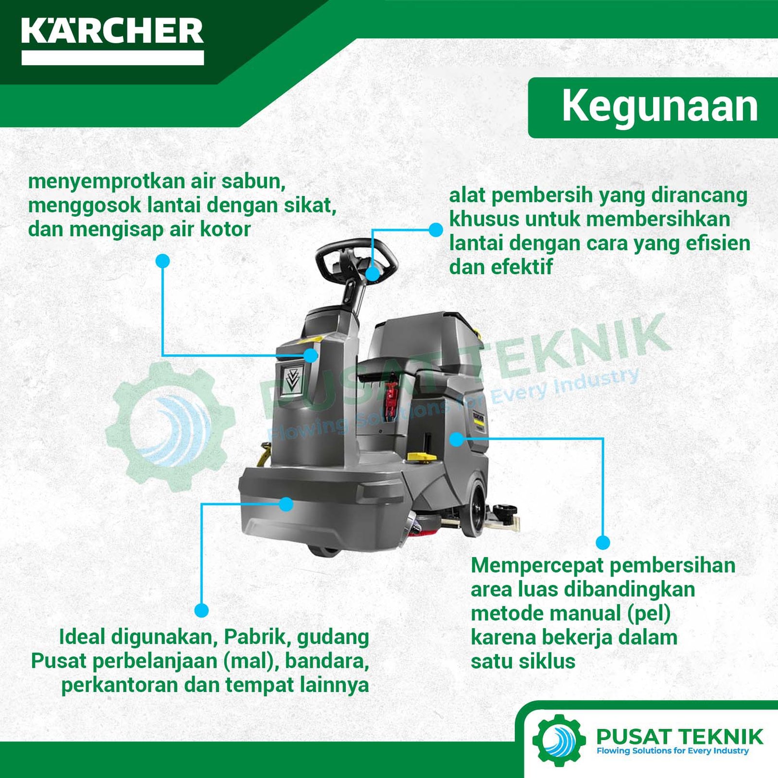 Membersihkan area lantai yang sangat luas kini tidak lagi memerlukan banyak tenaga kerja manual. Produk Karcher menghadirkan solusi cerdas melalui seri BD 50/70 R Bp Classic yang memungkinkan operator bekerja sambil duduk. Alat ini memiliki kemampuan manuver yang luar biasa sehingga sangat lincah saat melewati lorong-lorong sempit di dalam gudang, rumah sakit, ataupun pusat perbelanjaan.