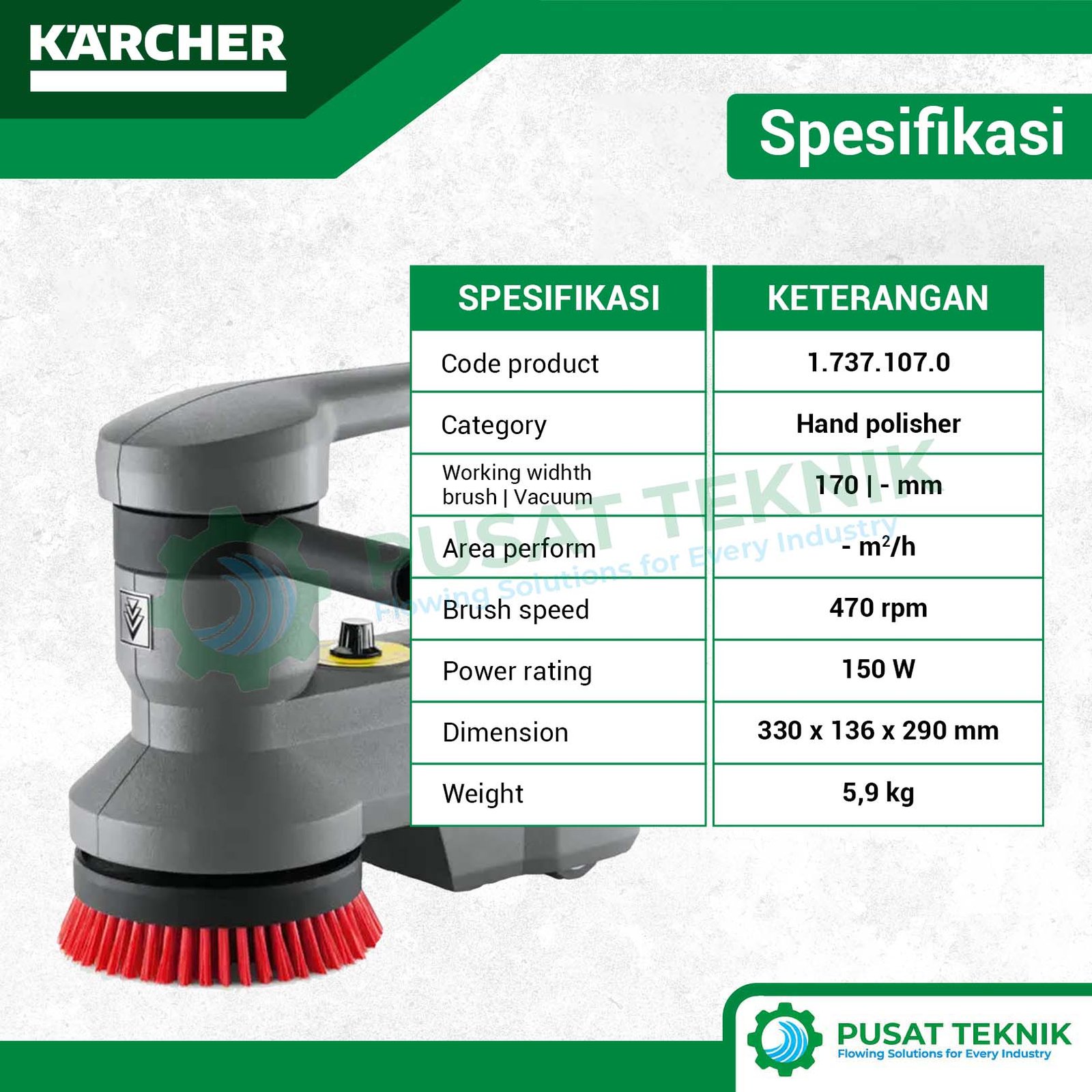 Kecepatan Variabel: Kecepatan sikat yang dapat disesuaikan (0-470 RPM) untuk berbagai tingkat kotoran.