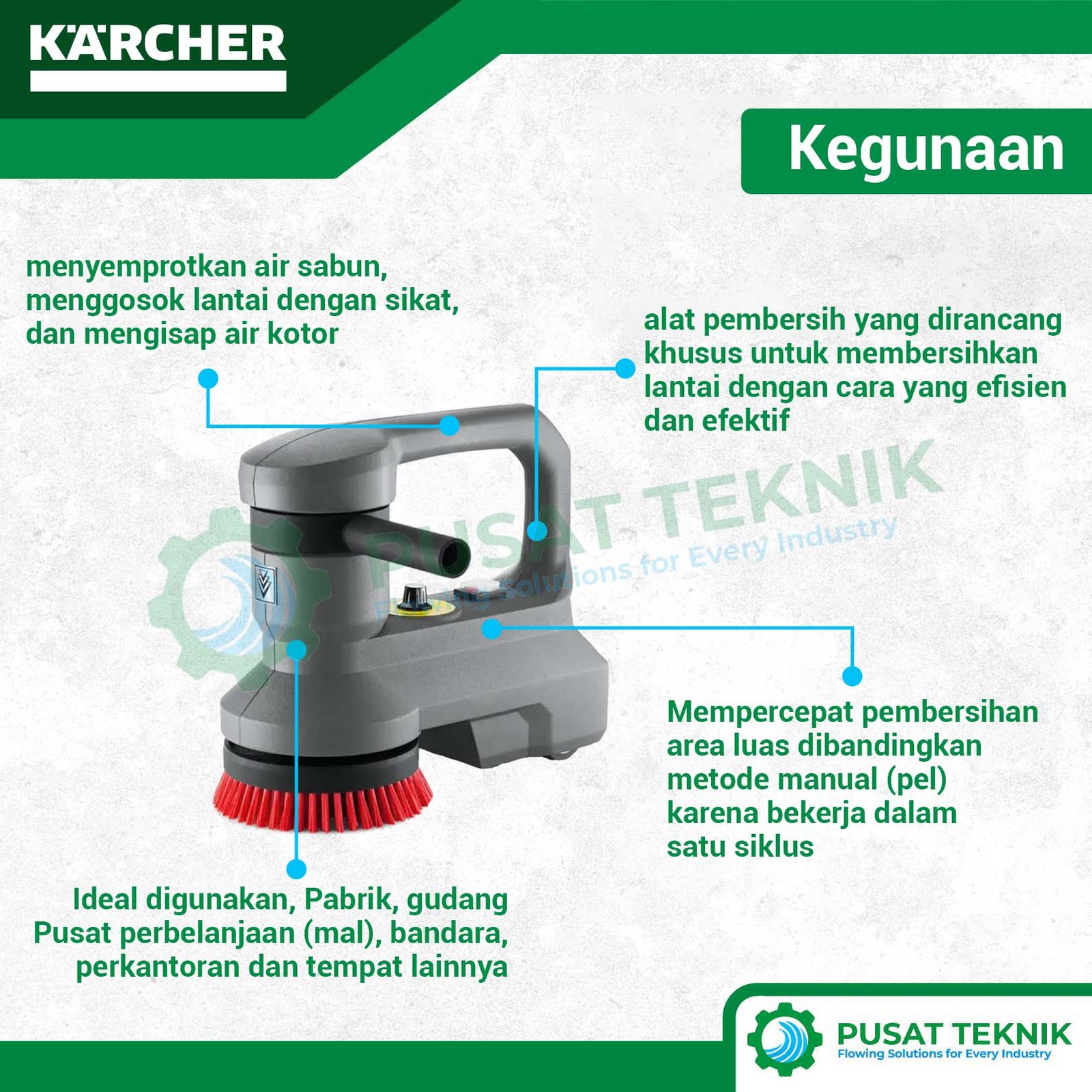 Keunggulan utama dari mesin scrubber tangan ini adalah fleksibilitasnya yang luar biasa pada permukaan kecil. Oleh karena itu, Anda bisa mengandalkannya untuk menyikat lantai kamar mandi atau area sudut yang sulit dijangkau oleh alat manual. Selain itu, penggunaan motor yang bertenaga namun stabil membuat mesin ini sangat andal untuk penggunaan intensif sehari-hari di area perhotelan maupun perkantoran.
