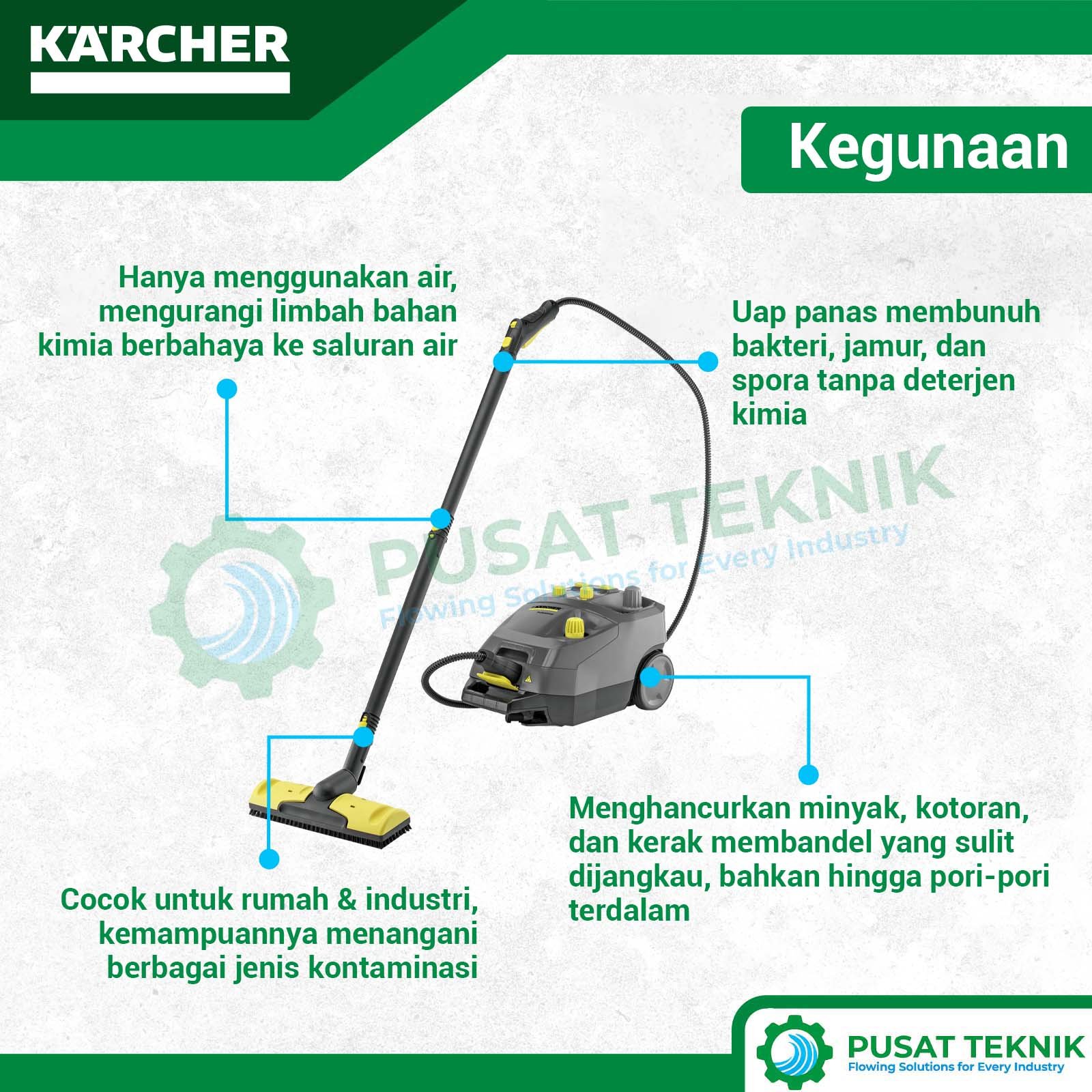 Investasi pada alat ini akan sangat membantu bisnis Anda dalam menghemat biaya operasional karena Anda tidak perlu lagi membeli banyak cairan pembersih khusus. Anda juga bisa menyimpan seluruh aksesoris pendukung langsung pada bodi mesin agar tidak mudah hilang saat proses pemindahan antar lokasi kerja. Keandalan teknologi uap asal Jerman ini memberikan kepastian bahwa seluruh kuman dan bakteri di fasilitas Anda akan musnah secara alami melalui suhu panas yang sangat terkendali.
