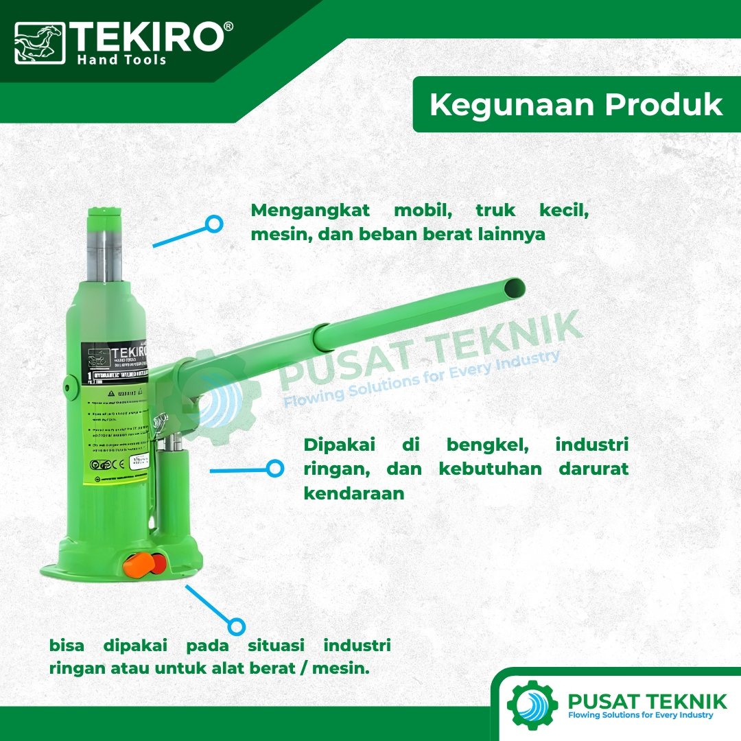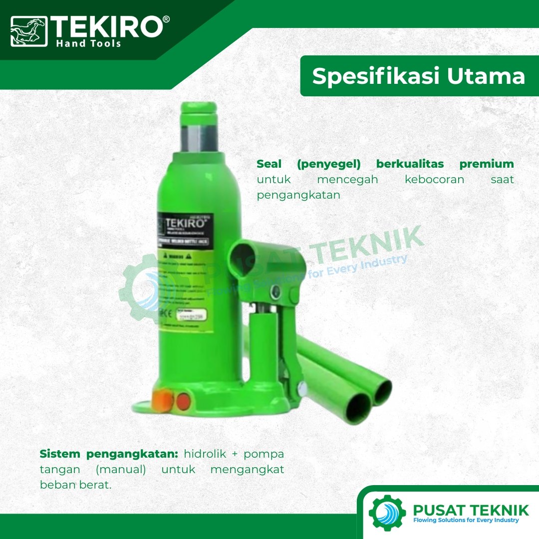 Selanjutnya, sebagai bagian dari lini alat industri & logistik unggulan, alat ini menggunakan baja berkualitas tinggi yang tahan terhadap tekanan ekstrem. Tekiro memproduksi dongkrak ini sesuai dengan Japanese Industrial Standard (JIS) guna menjamin kestabilan posisi saat menopang beban kerja Anda. Oleh karena itu, jika Anda sedang mencari alat angkat dan angkut yang memiliki daya tahan tinggi dan sistem keamanan berlapis, TEKIRO Hydraulic Bottle Jack adalah pilihan investasi yang sangat tepat.