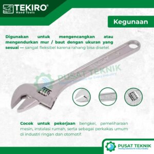 TEKIRO Adjustable Wrench hadir sebagai peralatan kelas profesional yang memberikan kekuatan cengkeraman maksimal pada berbagai ukuran mur dan baut. Produk dari brand tekiro ini menjadi andalan utama bagi para teknisi di sektor industri berat, proyek konstruksi, hingga bengkel alat berat. Tersedia dalam varian ukuran besar seperti 18 inci dan 24 inci, kunci ini memudahkan Anda menyelesaikan pekerjaan yang membutuhkan tenaga putar ekstra tanpa hambatan berarti.