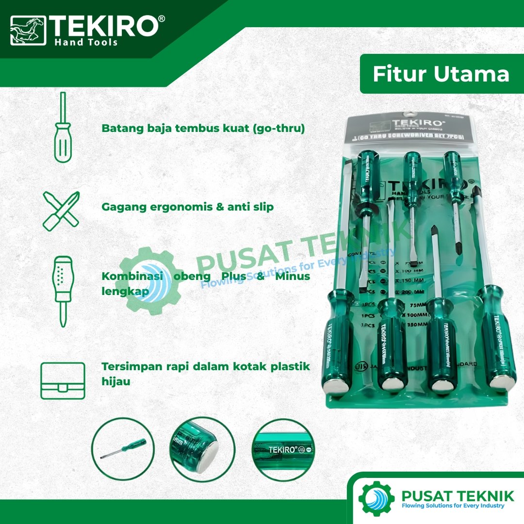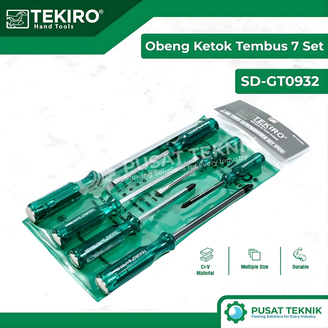 TEKIRO Obeng Ketok Tembus Set 7 Pcs (SD-GT0932) adalah pilihan utama untuk pekerjaan berat (Heavy Duty). Dengan batang baja Go-Thru yang menembus hingga pangkal gagang, obeng ini aman dipukul palu untuk melepas baut macet. Set lengkap (4 Minus, 3 Plus) berstandar JIS ini menawarkan kekuatan, kepresisian, dan kenyamanan dalam satu paket profesional.