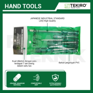TEKIRO Obeng Ketok Tembus Set 7 Pcs adalah pilihan terbaik untuk Anda yang membutuhkan alat kerja tangguh dan tahan banting. Didesain khusus untuk pekerjaan berat, obeng ini memiliki teknologi Go-Thru Shaft (tembus ke gagang), yang memungkinkan hantaman palu langsung diteruskan ke ujung obeng tanpa merusak alat. Set ini berisi 7 buah obeng profesional berkualitas tinggi, terdiri dari 4 obeng slotted (minus) dan 3 obeng Phillips (plus) dalam berbagai ukuran, cocok untuk berbagai kebutuhan teknis dan industri.