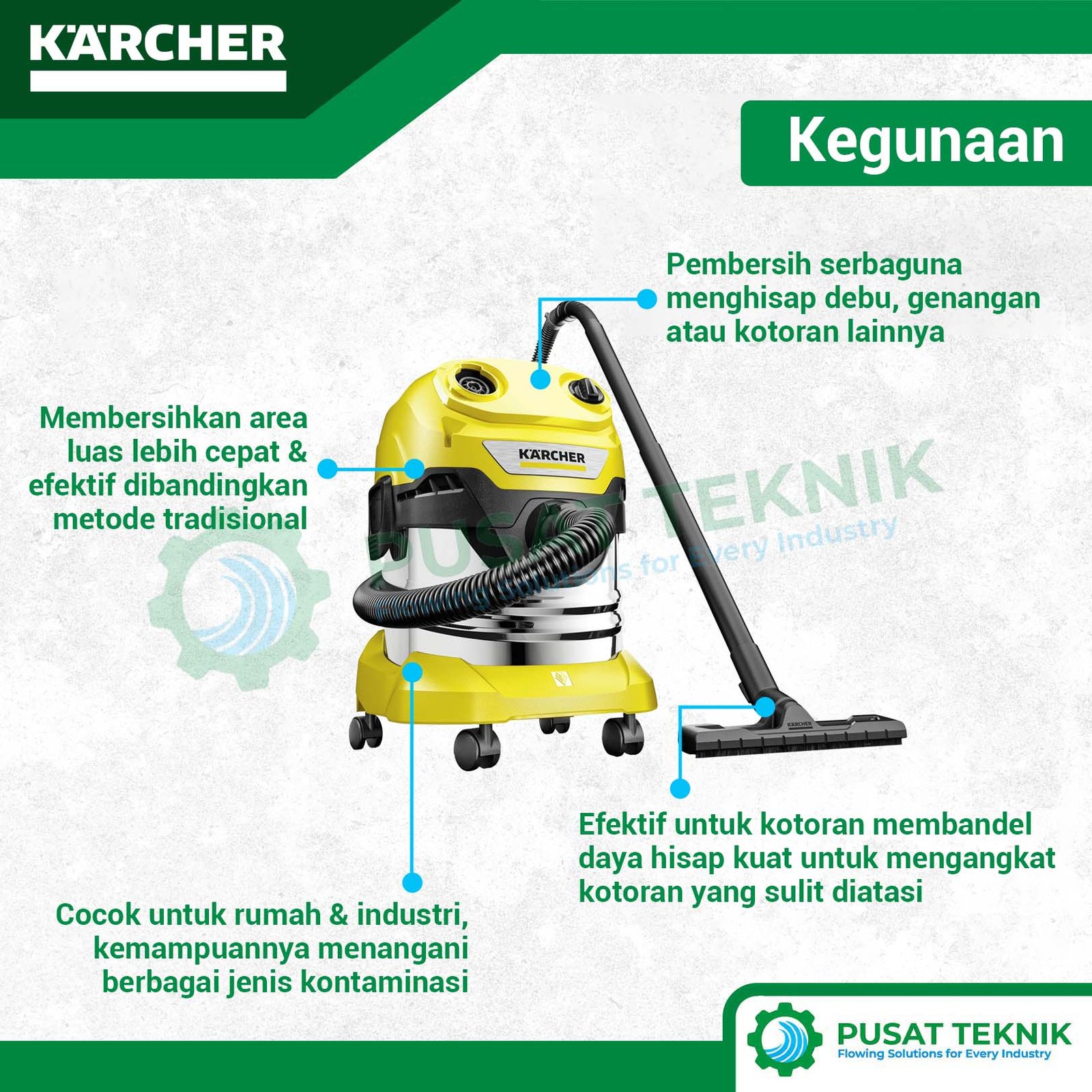 Meskipun memiliki kapasitas penampung yang besar, unit ini tetap sangat mudah Anda gerakkan ke berbagai arah berkat roda transportasi yang lincah. Material stainless steel pada bodinya memberikan kesan mewah sekaligus menjamin masa pakai alat yang jauh lebih panjang karena sifatnya yang anti karat. Penggunaan mesin jet cleaner memang efektif untuk area luar rumah, tetapi untuk menjaga kebersihan lantai interior dan bengkel dari debu konstruksi, vacuum cleaner ini adalah solusi paling tepat. Segera miliki Karcher WD 4 S V-20/6/22 untuk merasakan pengalaman membersihkan rumah yang lebih profesional, bertenaga, dan tentu saja sangat efisien.
